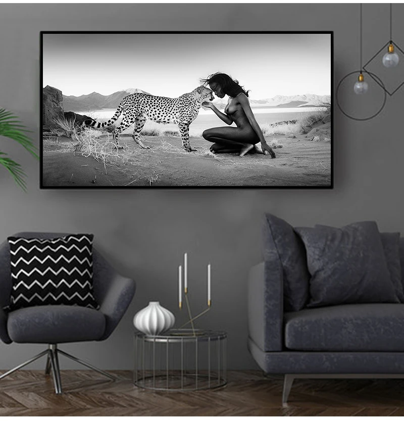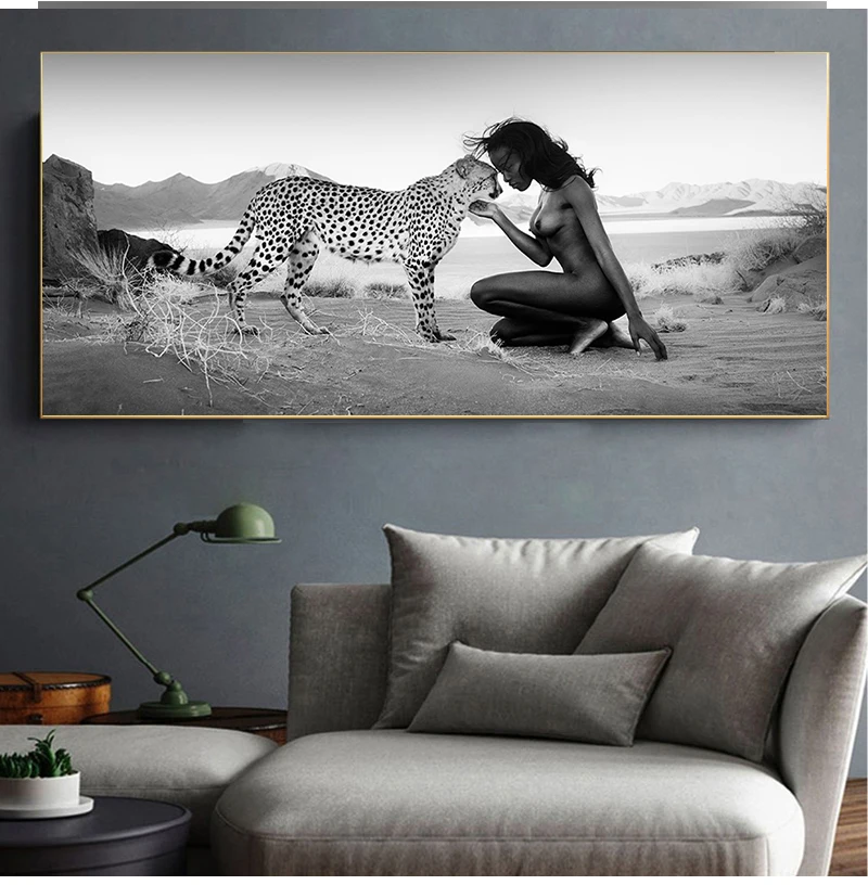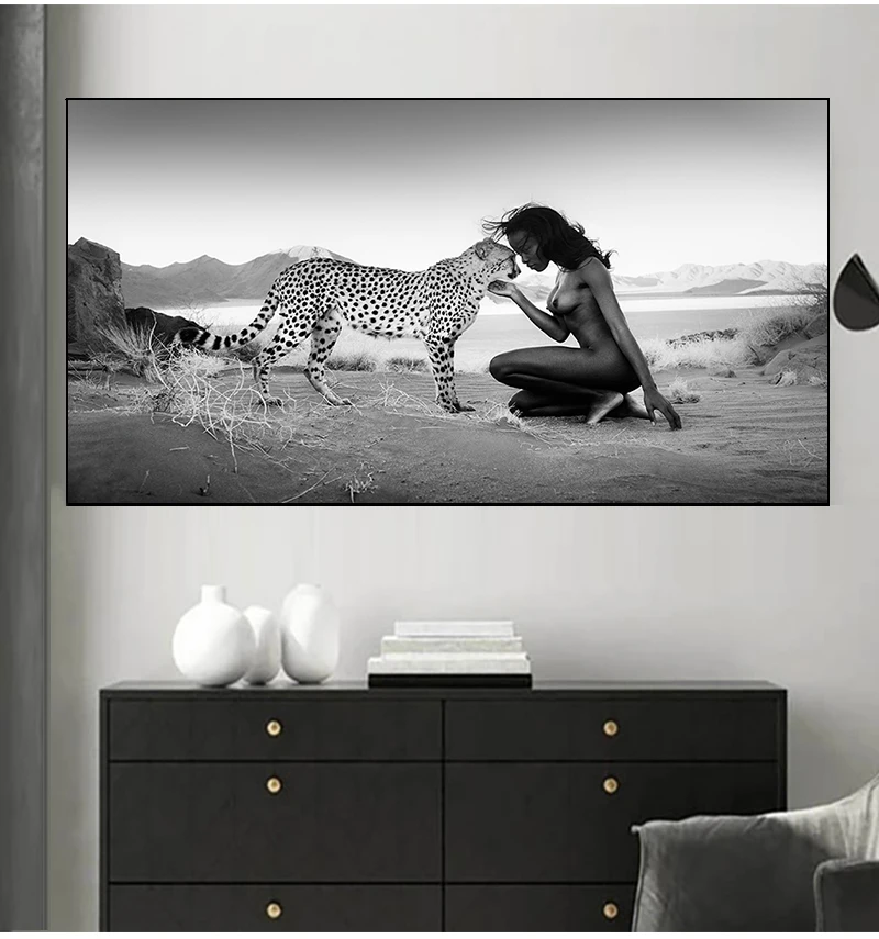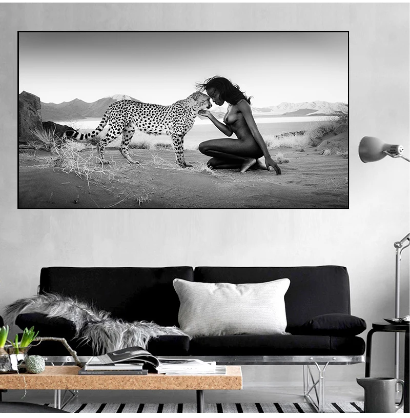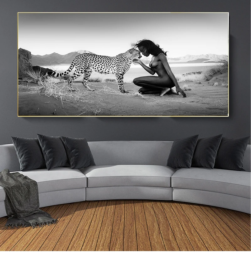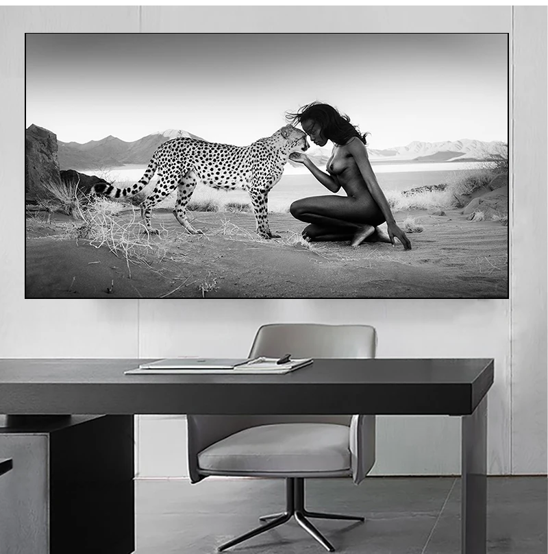 Rid your home of wasted empty wall space with this one-of-a-kind canvas art. The artistic Black and White Snow Leopard with Nude Woman canvas design shows the beautiful contrast and presents an elegant touch of artistry that will add a pop of beauty into your home!