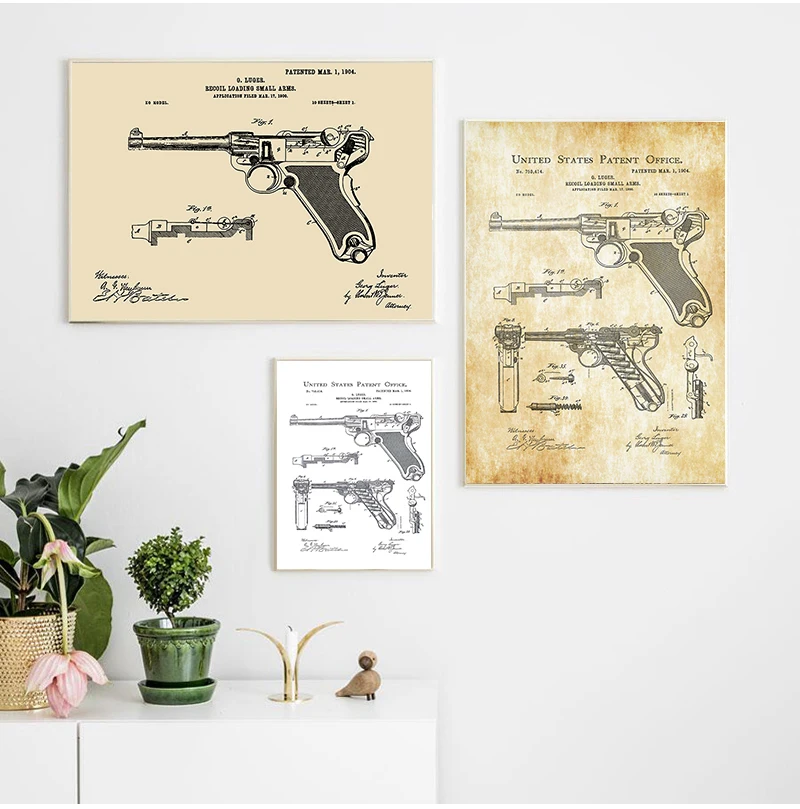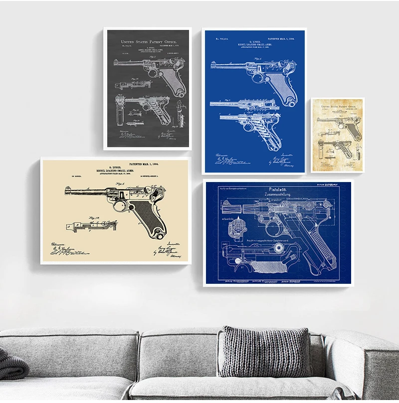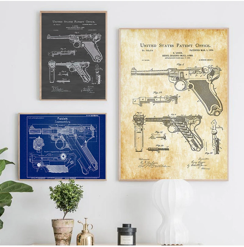 Rid your home of wasted empty wall space with this one-of-a-kind canvas art. The artistic Gun Luger Pistol Patent Blueprint canvas design shows the beautiful contrast and presents an elegant touch of artistry that will add a pop of beauty into your home!
