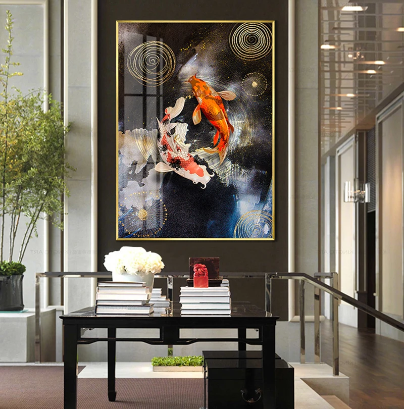 Rid your home of wasted empty wall space with this one-of-a-kind canvas art. The artistic Luxurious Chinese Koi Fish canvas design shows the beautiful contrast and presents an elegant touch of artistry that will add a pop of beauty into your home!