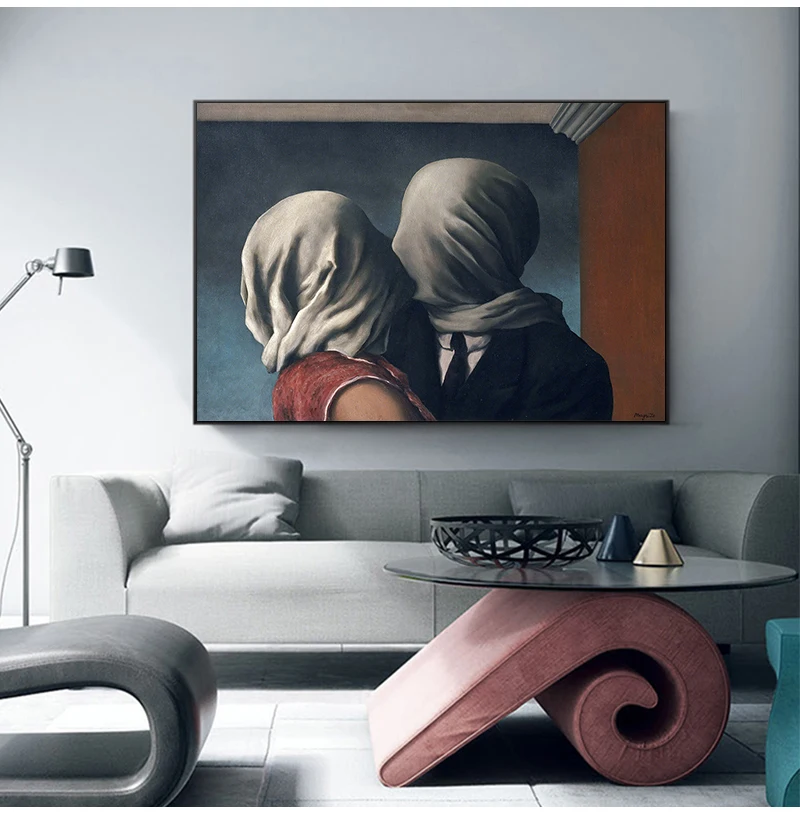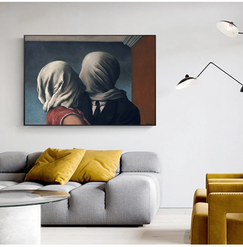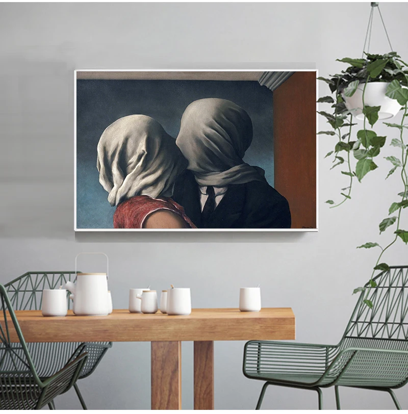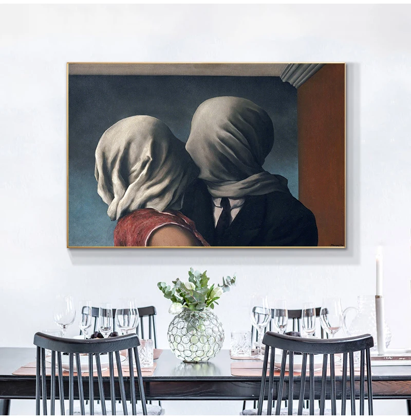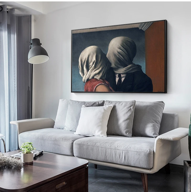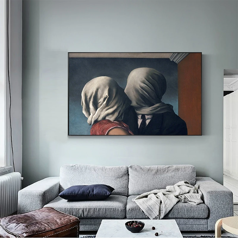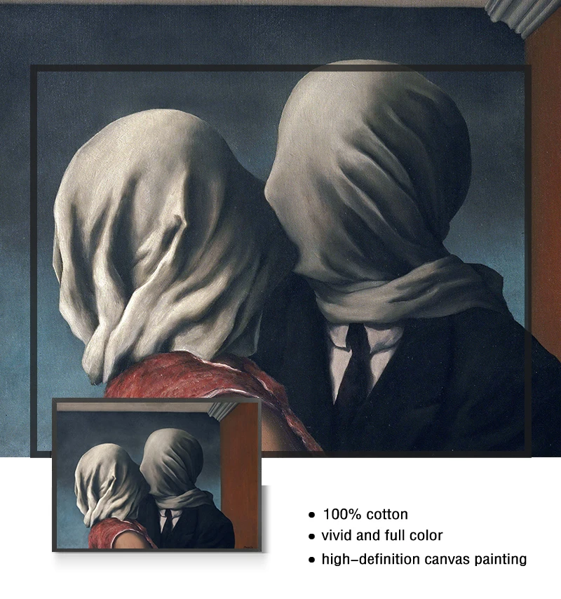 Rid your home of wasted empty wall space with this one-of-a-kind canvas art. The artistic The Lovers by Ren? Magritte canvas design shows the beautiful contrast and presents an elegant touch of artistry that will add a pop of beauty into your home!